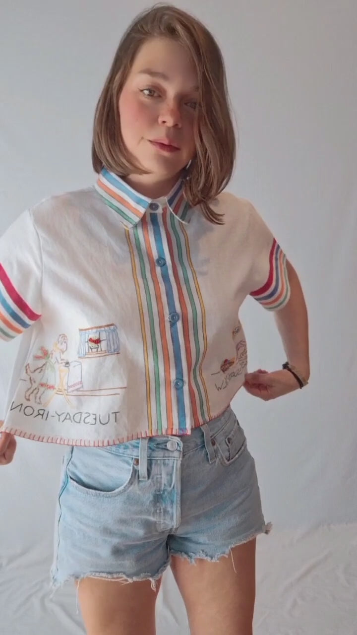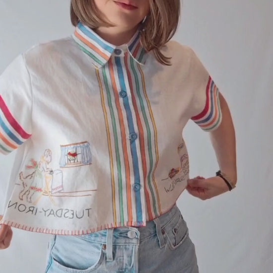 ENG: Super pretty button up shirt handmade in Spain with 3 vtg floursack tea towels. Insane embroideries full of details, with a midcentury classic: days of the week + chores. 50-60's, USA. Rainbow stripes at front, collar and sleeves.