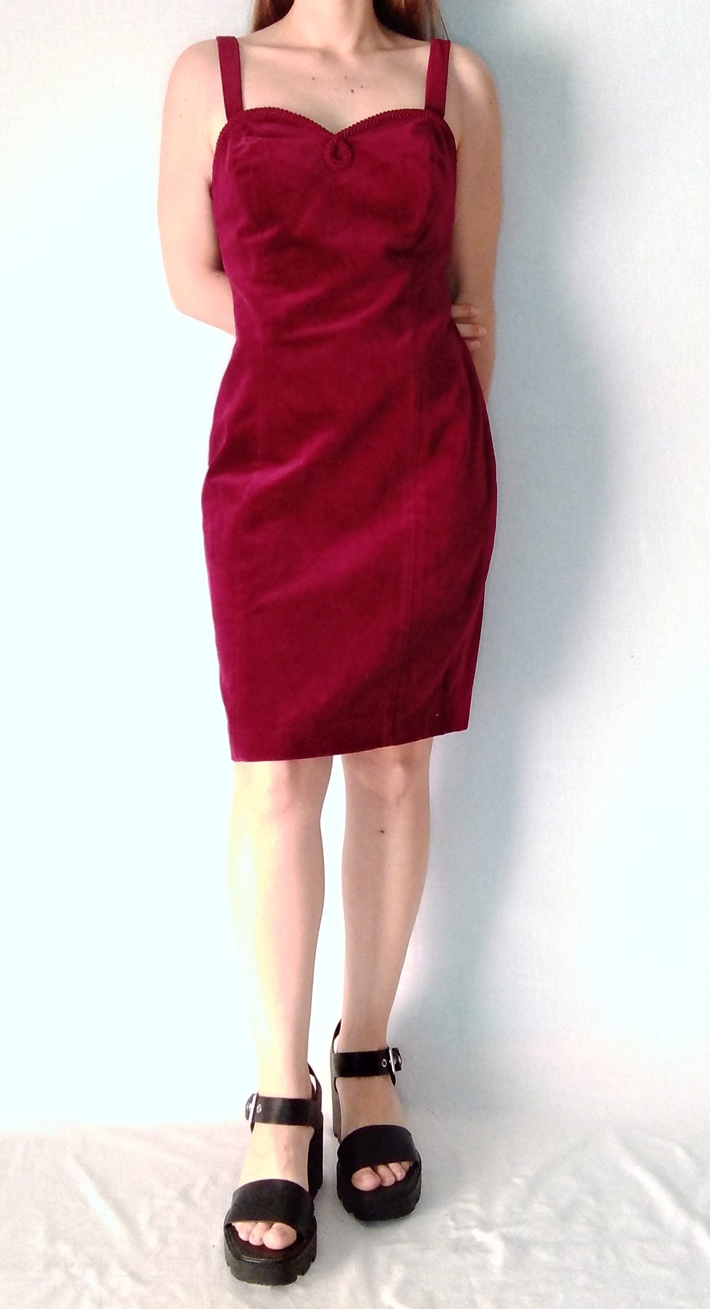 Super pretty vintage party minidress. Intense burgundy velvet. Basic fitted and flattering shape with sweetheart neckline belled with braided trim. Rear zipper, lined. Made in spain. Perfect with your favourite jewelry.